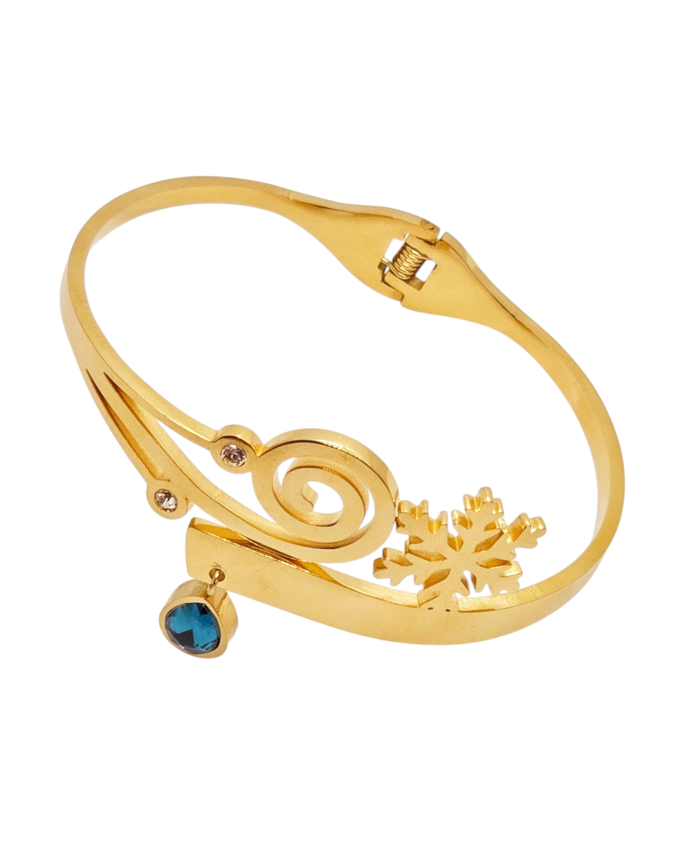 Make a graceful statement with the Adorniv Blue Crystal Drop Bracelet. This gold-tone piece features a delicate swirl motif accented by a snowflake-inspired cut-out and a vibrant blue crystal charm drop. Finished with a secure clasp, its design captures a sense of whimsy and elegance, perfect for elevating both casual and festive looks.