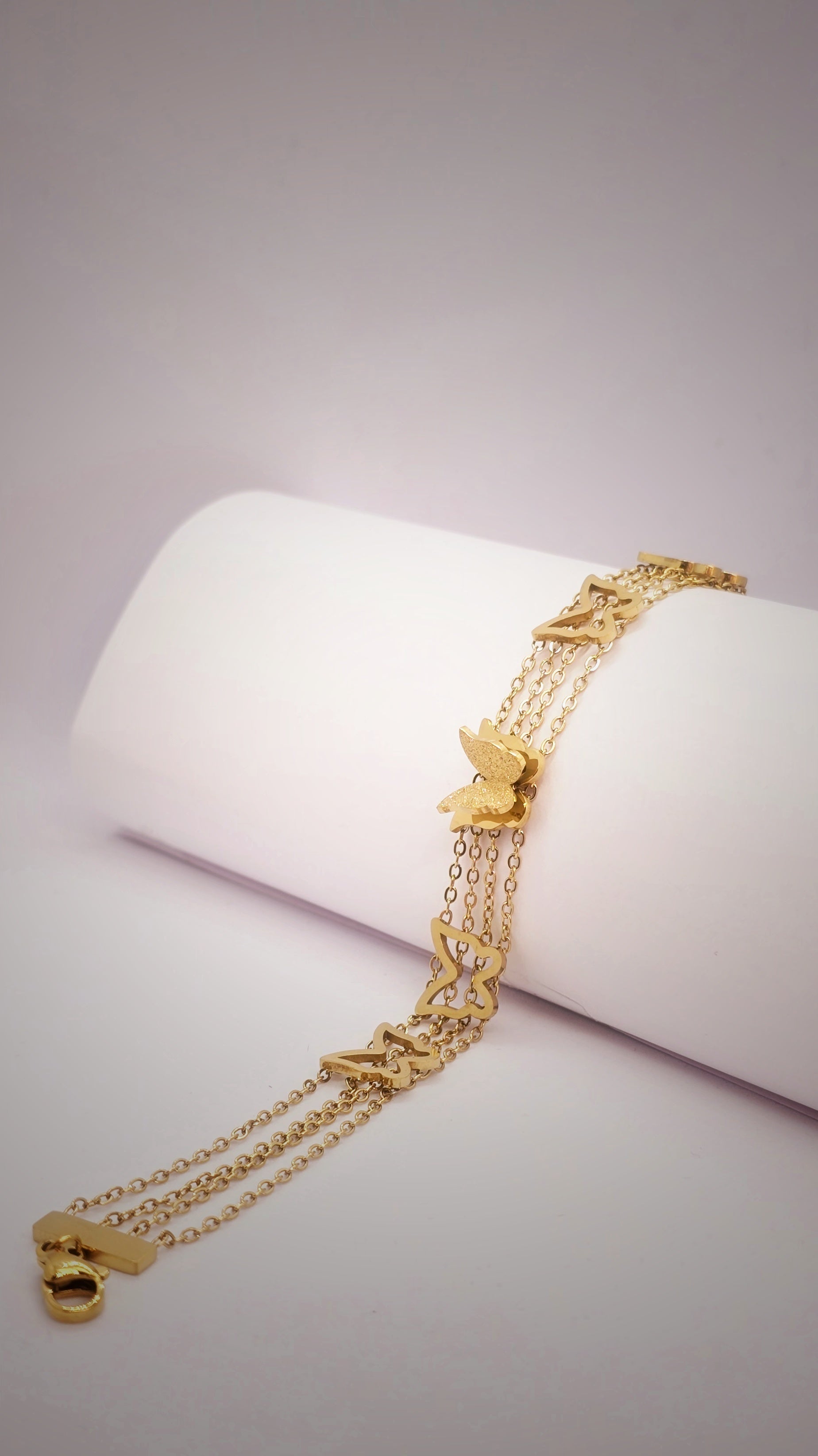 Make a subtle statement with this Butterfly Bloom Multi-layered Bracelet, designed with precision and polish. Crafted in 18K gold tone plating, it features a unique combination of delicate butterfly cutouts and openwork shapes along layered chains, creating a balanced and refined look. Lightweight yet noticeable, this bracelet blends simplicity with modern charm, ideal for everyday wear or dressing up your evening look.