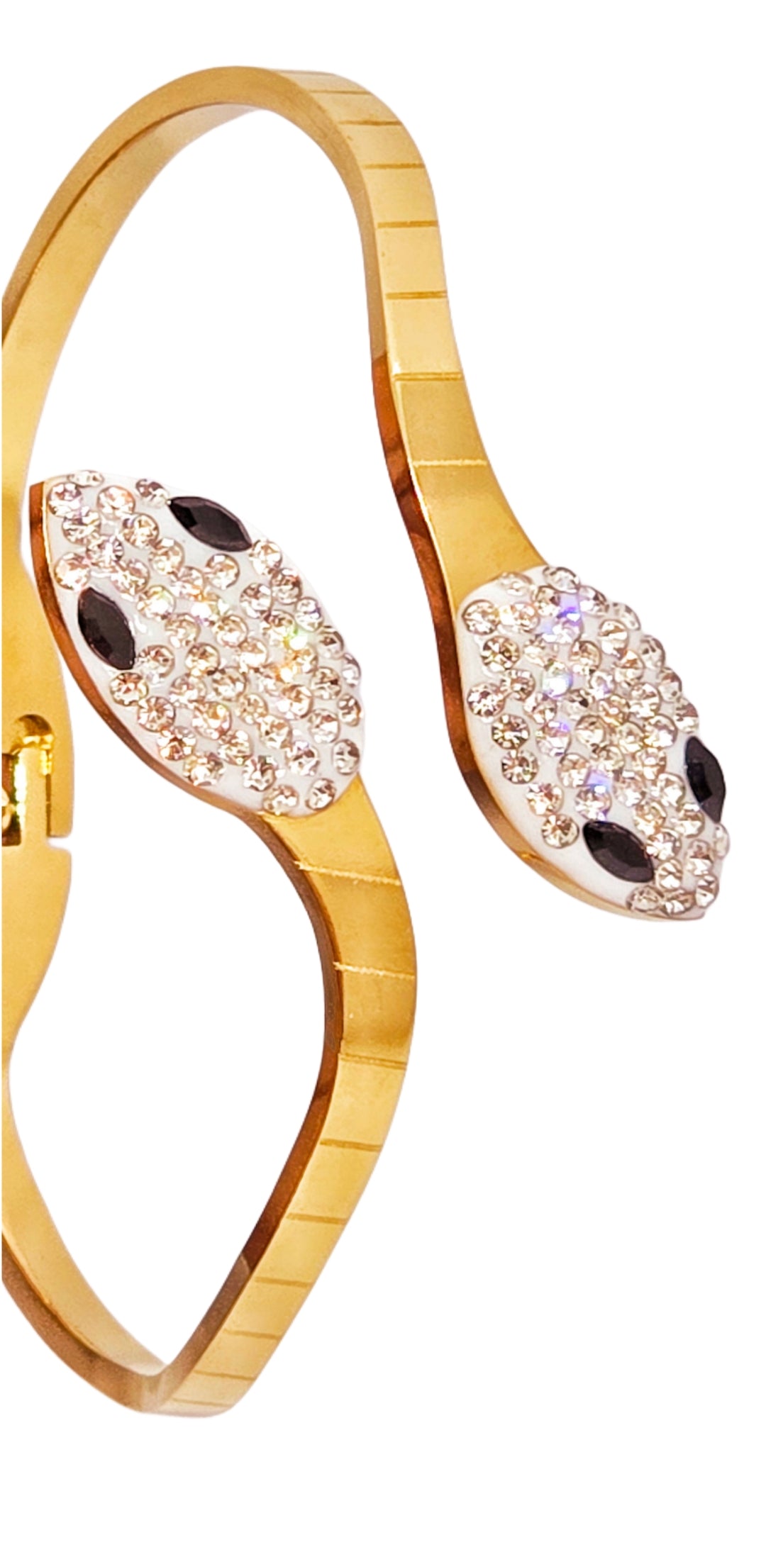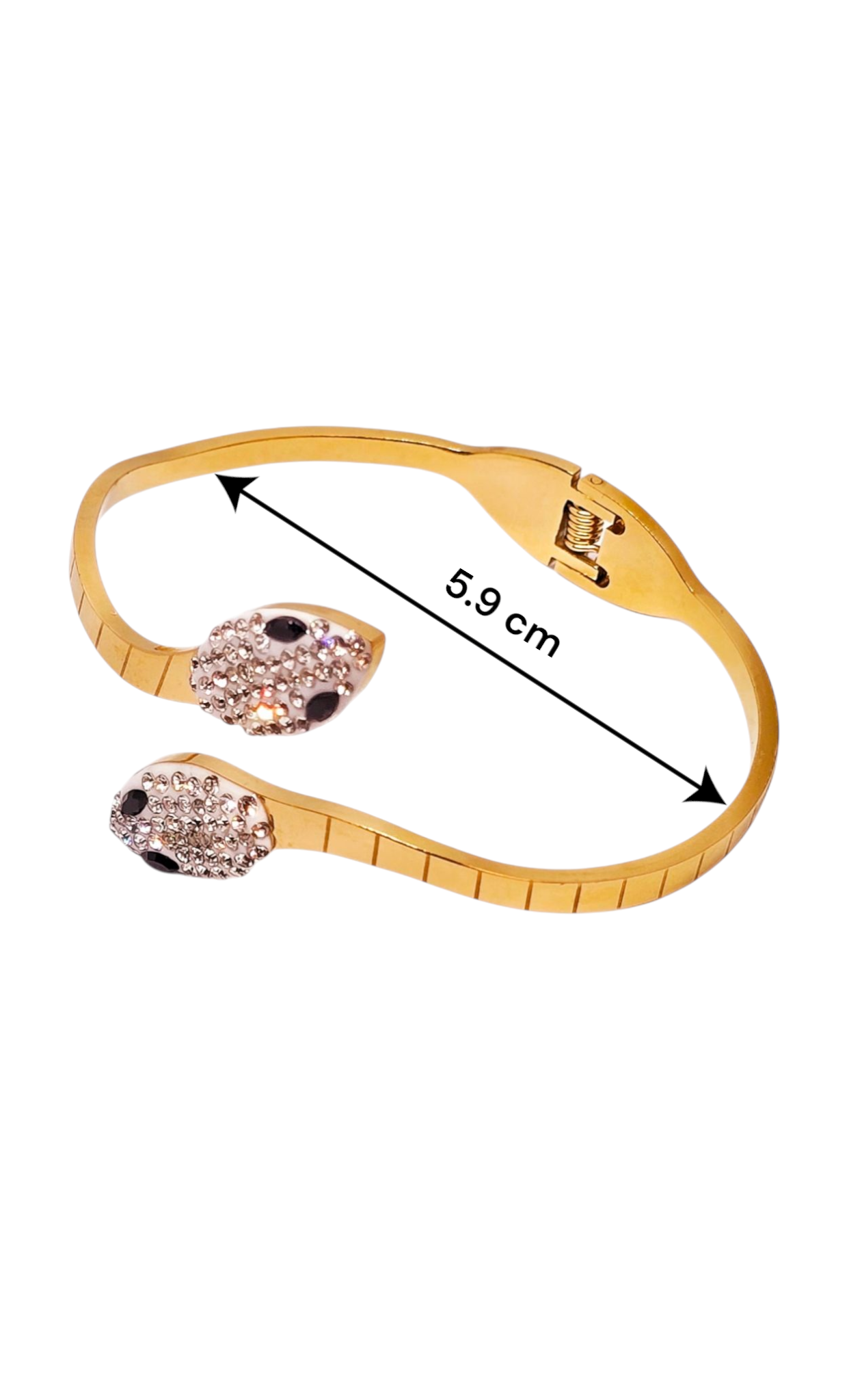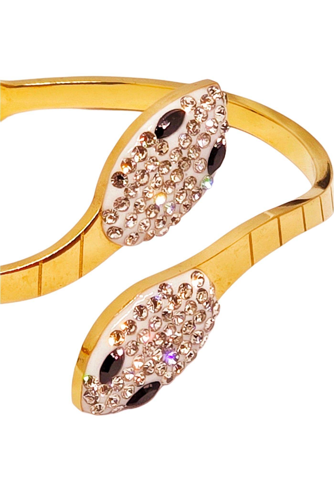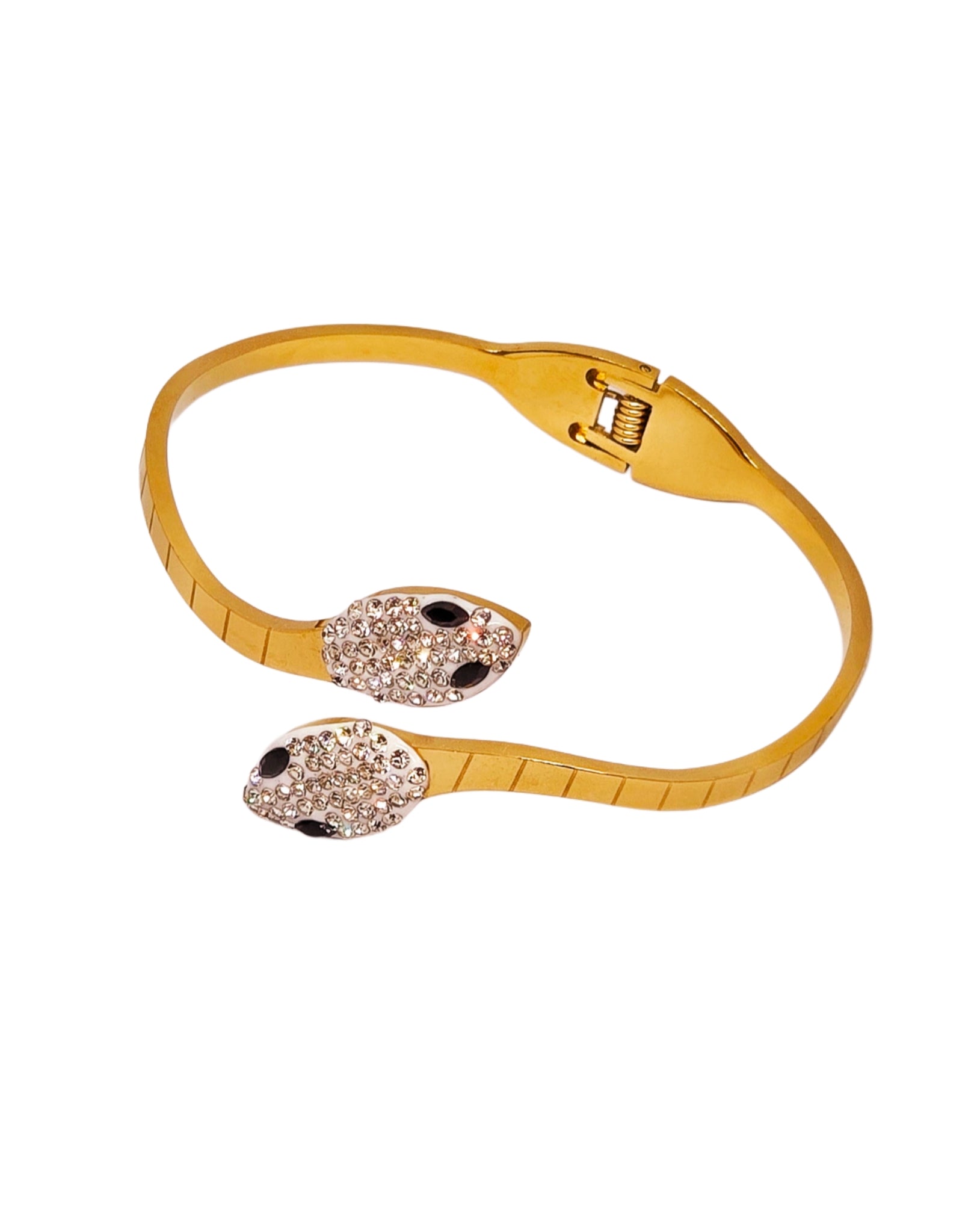 Unleash your inner power with the Adorniv Dual Snake Head Gold Bracelet. This bold and symbolic design features two intricately crafted snake heads adorned with shimmering crystals and deep black enamel eyes – a symbol of transformation, protection, and strength.