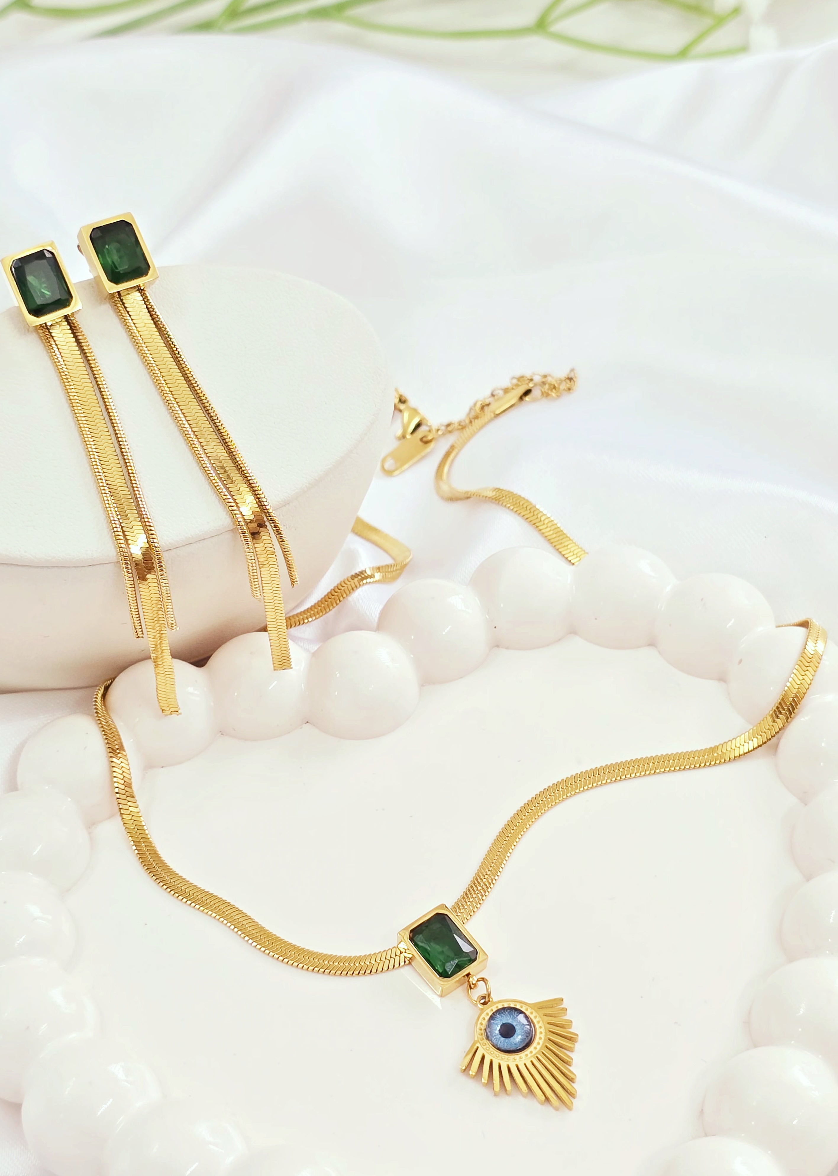The Adorniv Emerald Luxe Trio Set is Adorniv’s most premium creation, designed to embody elegance and sophistication. Crafted with a sleek gold finish and adorned with deep green emerald-cut stones, this set includes a graceful necklace, statement drop earrings, and a delicate bracelet. A timeless fusion of modern design and classic charm, this set elevates any look with effortless luxury.