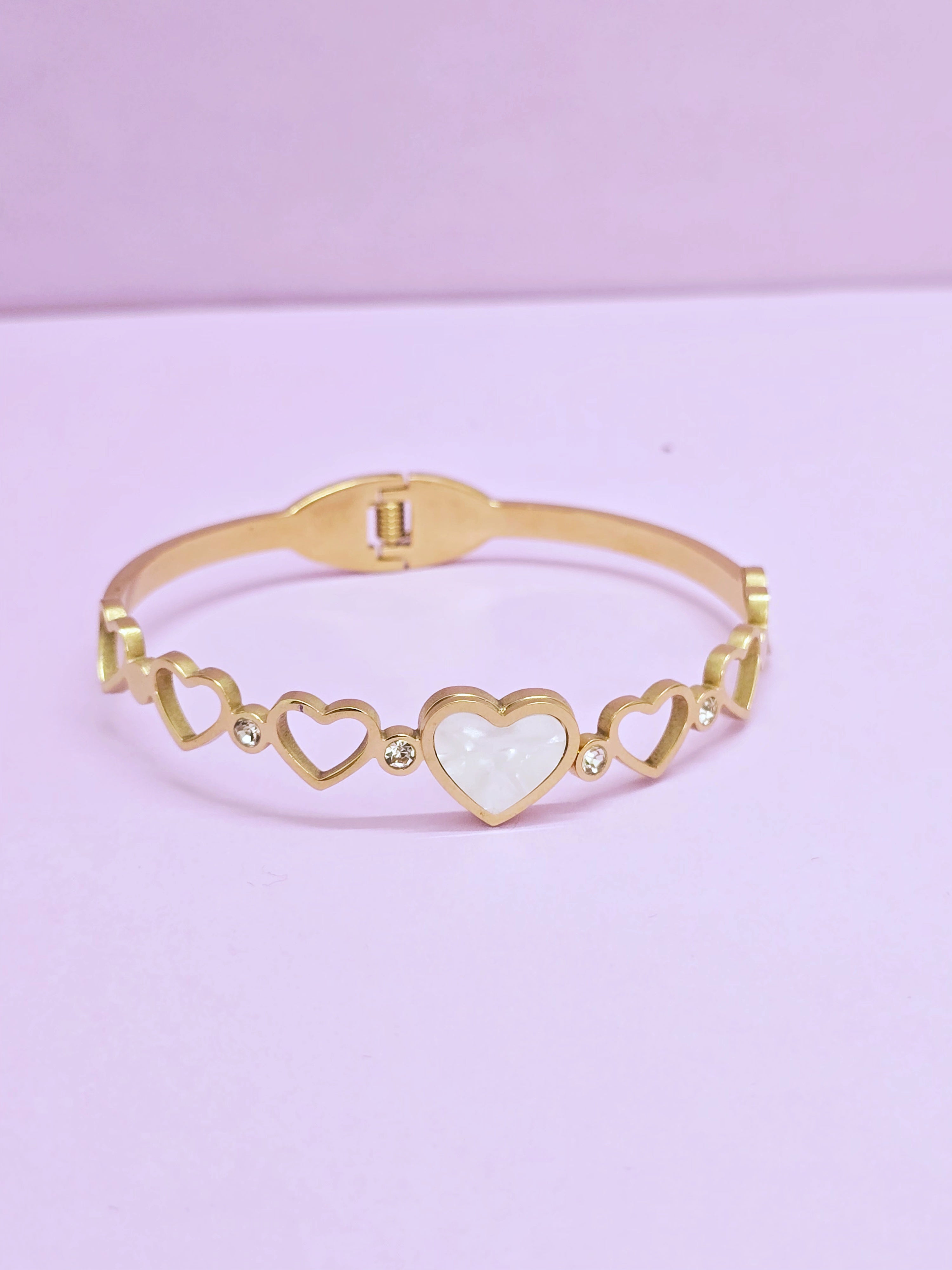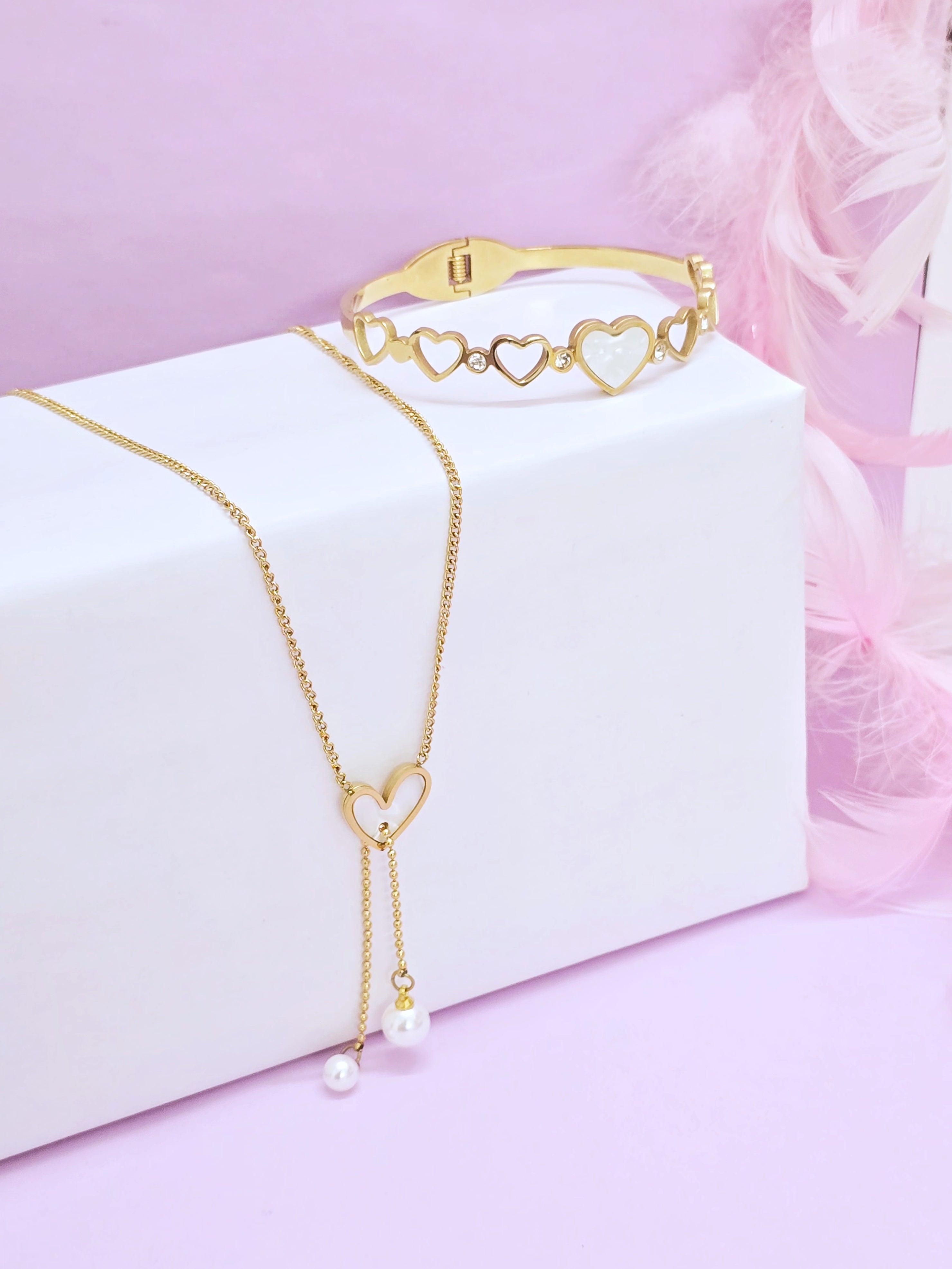 Celebrate love, elegance, and timeless style with the Adorniv Eternal Heart Gift Set – a beautifully curated gift set featuring our Heart Glow Bangle Bracelet and Heart Pearl Drop Luxe Chain. Designed in radiant gold tones, the bracelet charms with an array of open heart motifs accented with crystals and a central heart in luminous mother-of-pearl. The matching necklace features a delicate open-heart pendant with dangling pearl drops for a graceful finish. Perfect as a thoughtful gift for your partner, mother, sister, or dear friend, this set is a complete expression of affection and style.