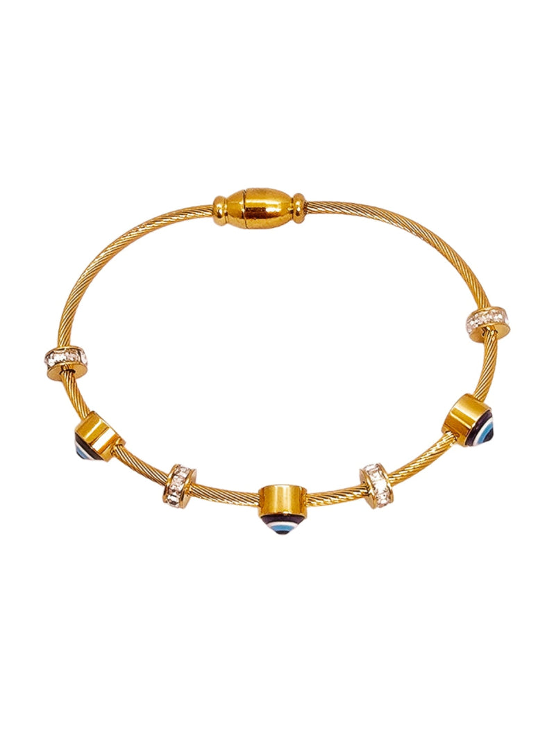 Featuring a twisted cable design adorned with cubic zirconia-studded spacers and striking evil eye charms, this bracelet blends protection and luxury in perfect harmony. Whether worn solo or layered, it offers a timeless look without compromising comfort or quality.