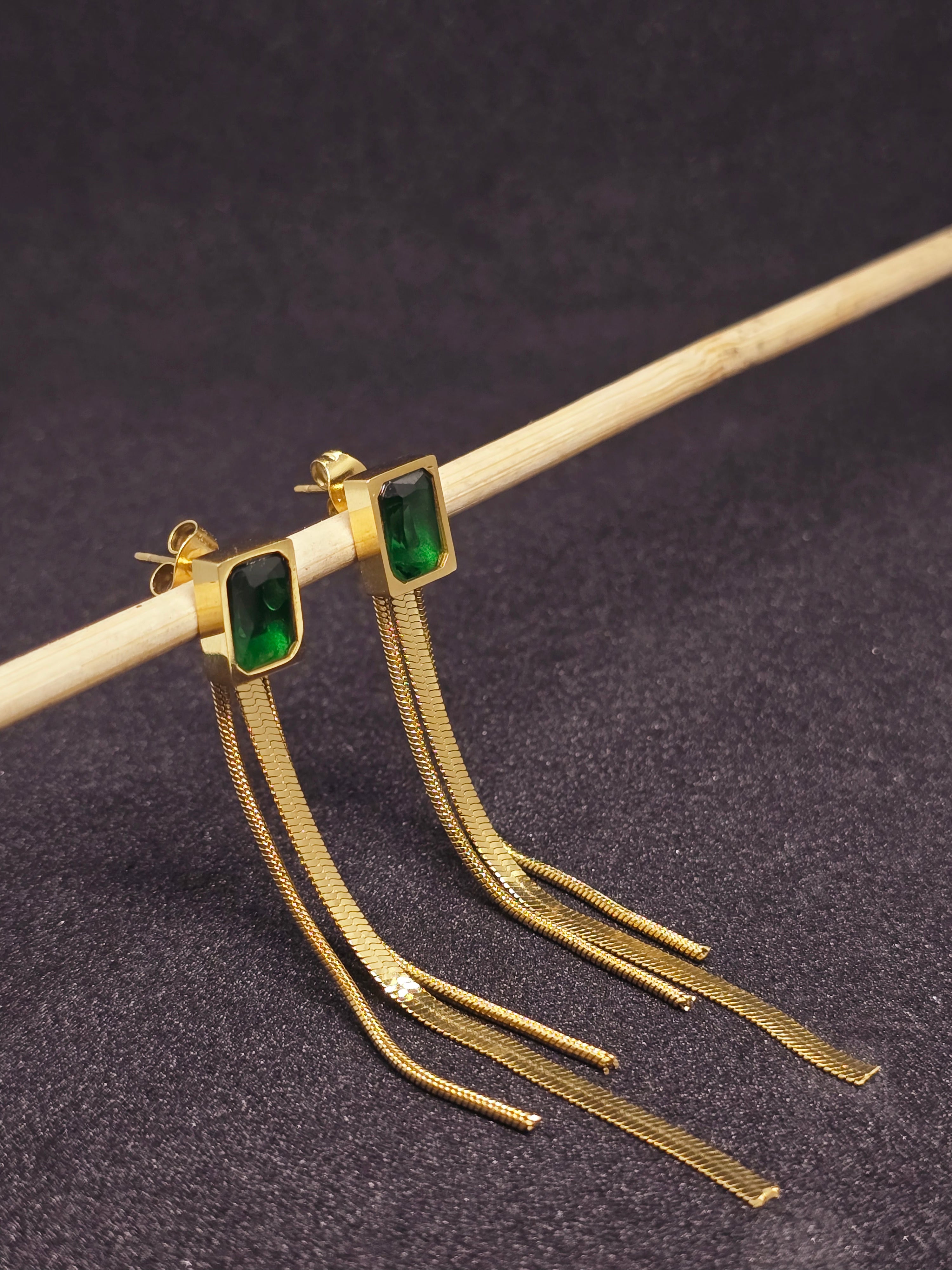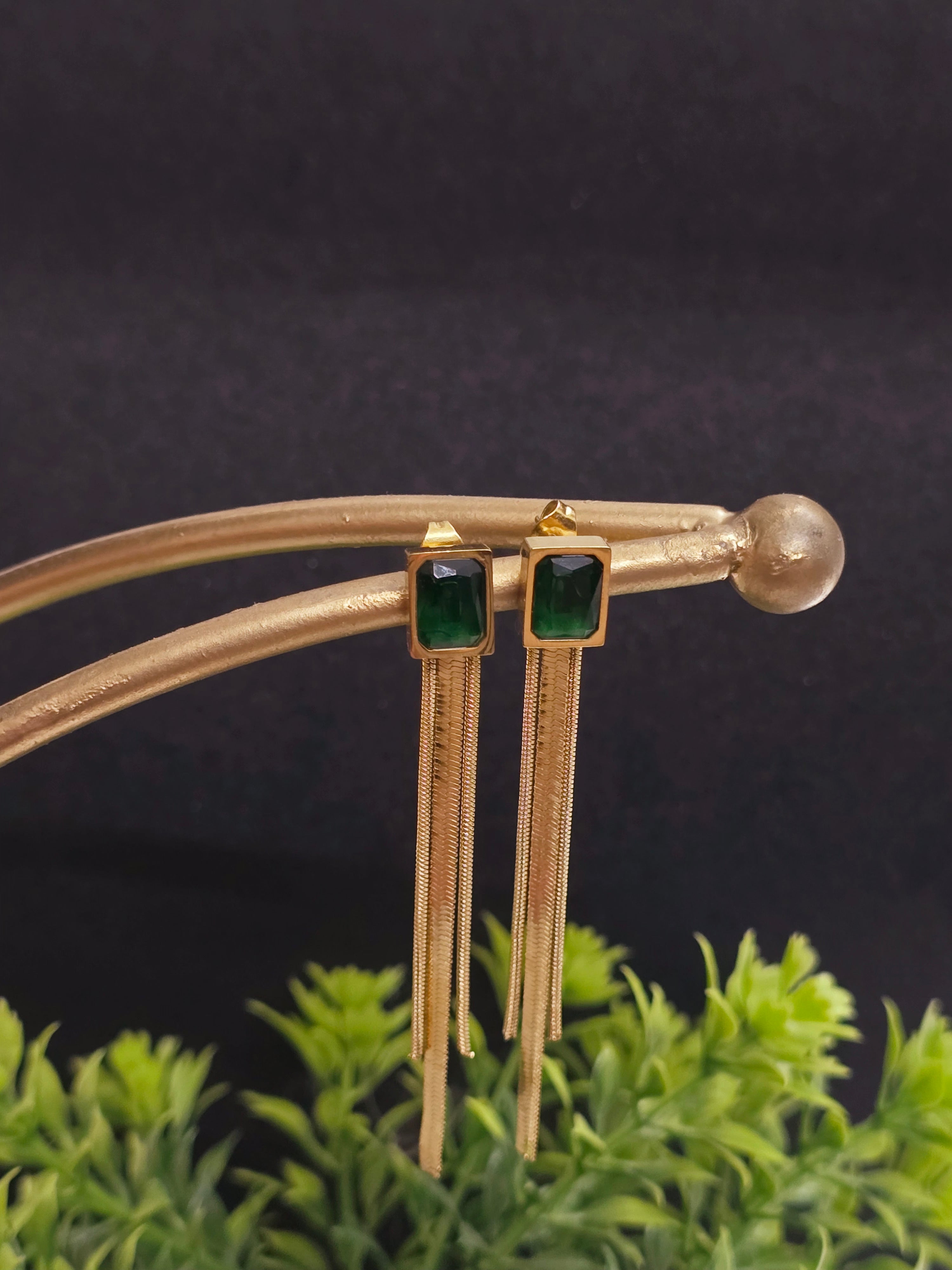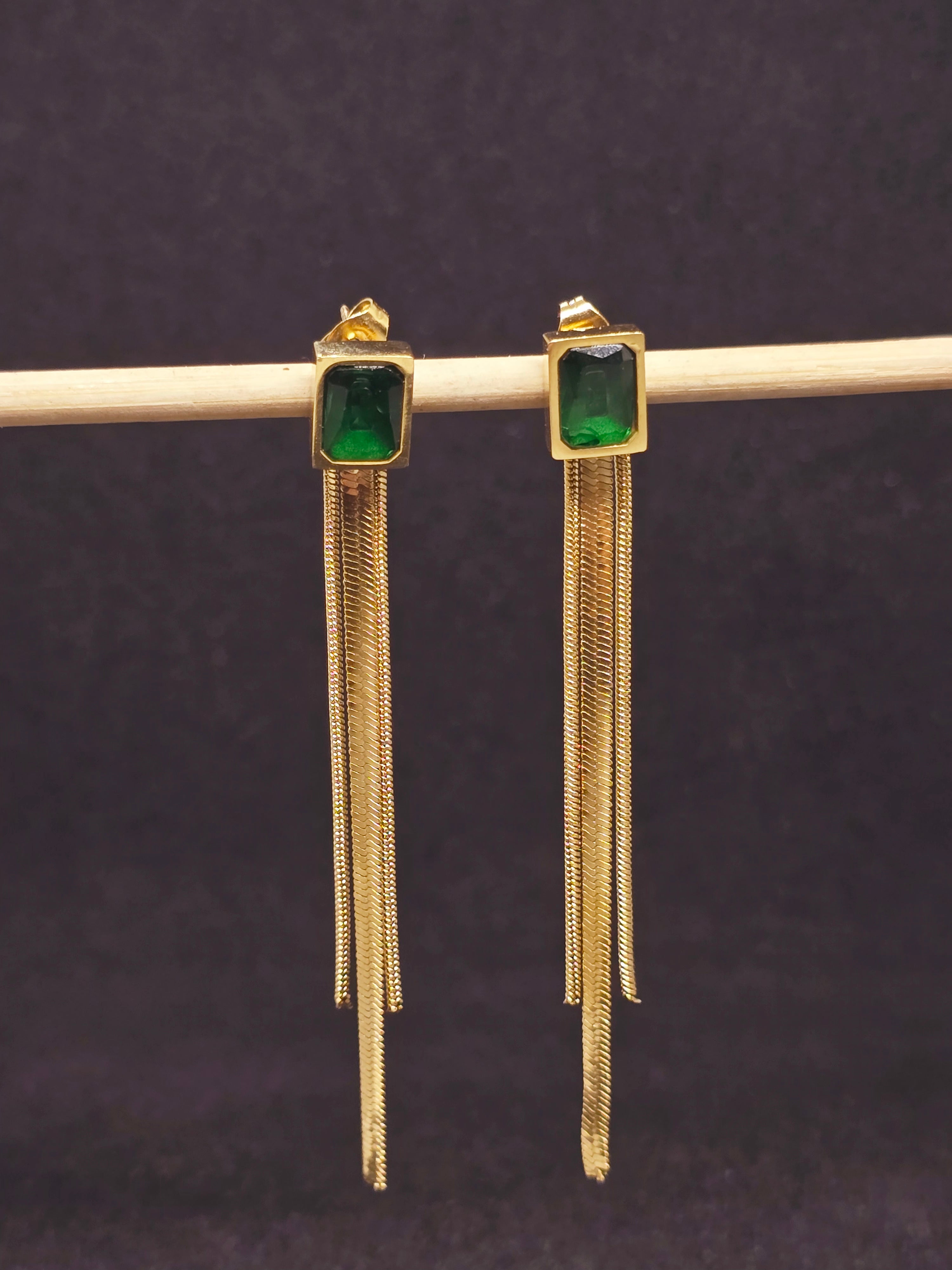 Elevate your accessory game with the Adorniv Green Stone Charm Earring – Premium Set, a statement piece that speaks volumes with elegance. Featuring a bold emerald-green rectangular stone and sleek gold-finish twin tassels, these earrings bring a luxurious blend of color and motion to your ensemble. Perfect for those who love standout elegance with a modern twist.