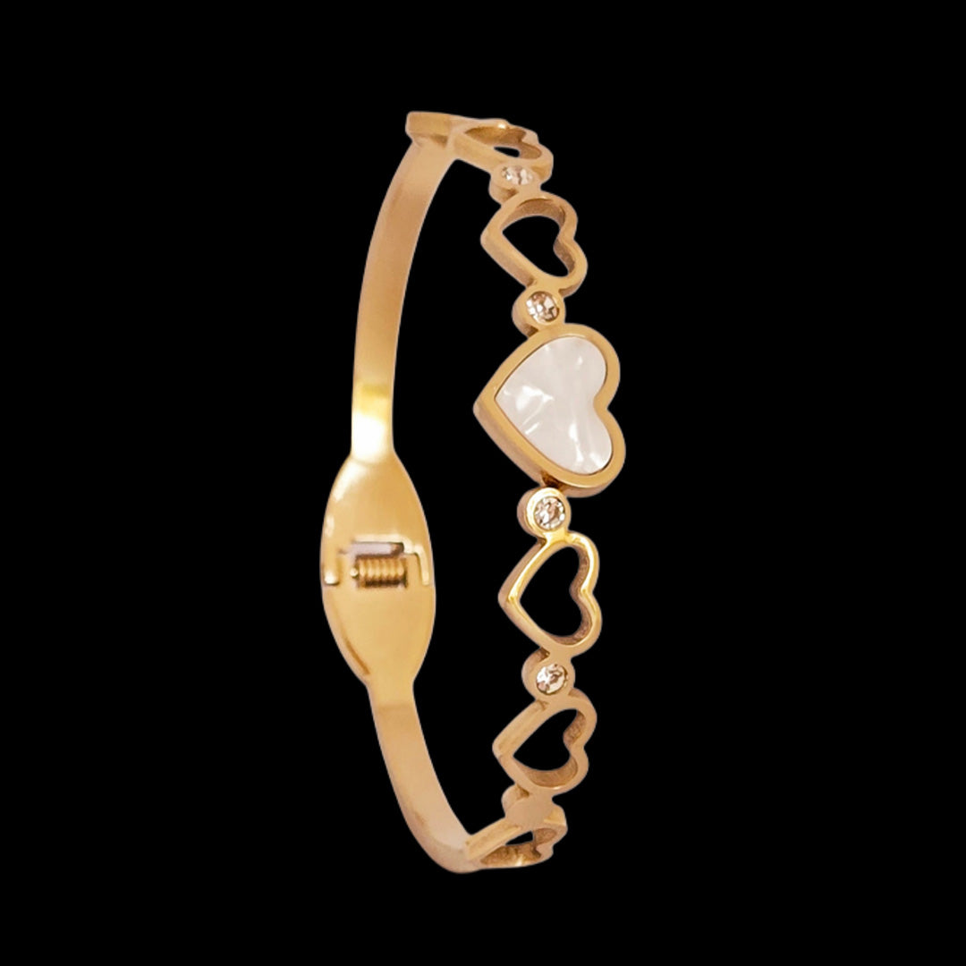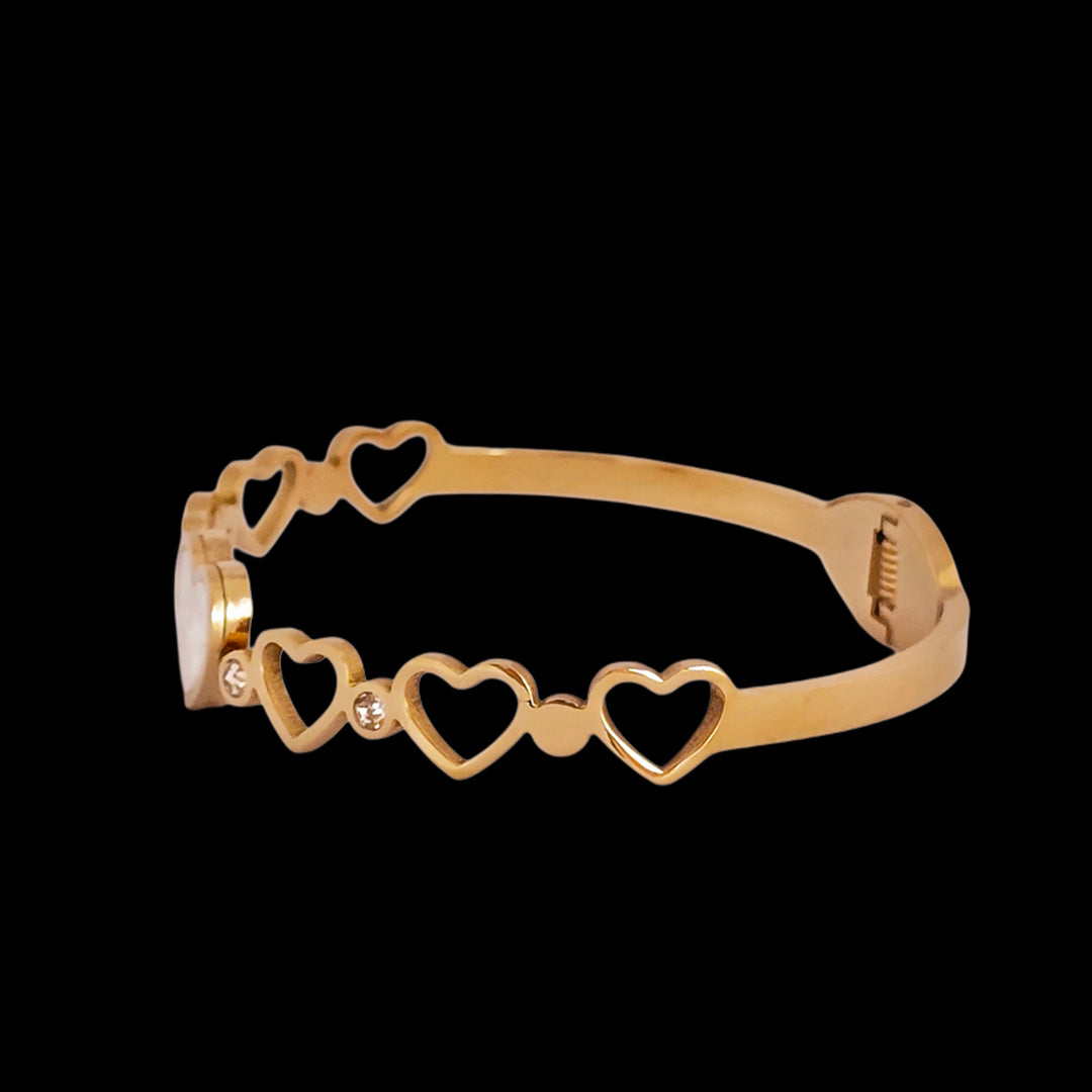 Crafted from premium 18K gold-plated stainless steel, this bracelet is anti-tarnish, waterproof, sweatproof, and hypoallergenic – designed to retain its luxury look while being gentle on your skin. Its spring-hinge closure offers both comfort and secure wear, making it ideal for everyday use or special moments.