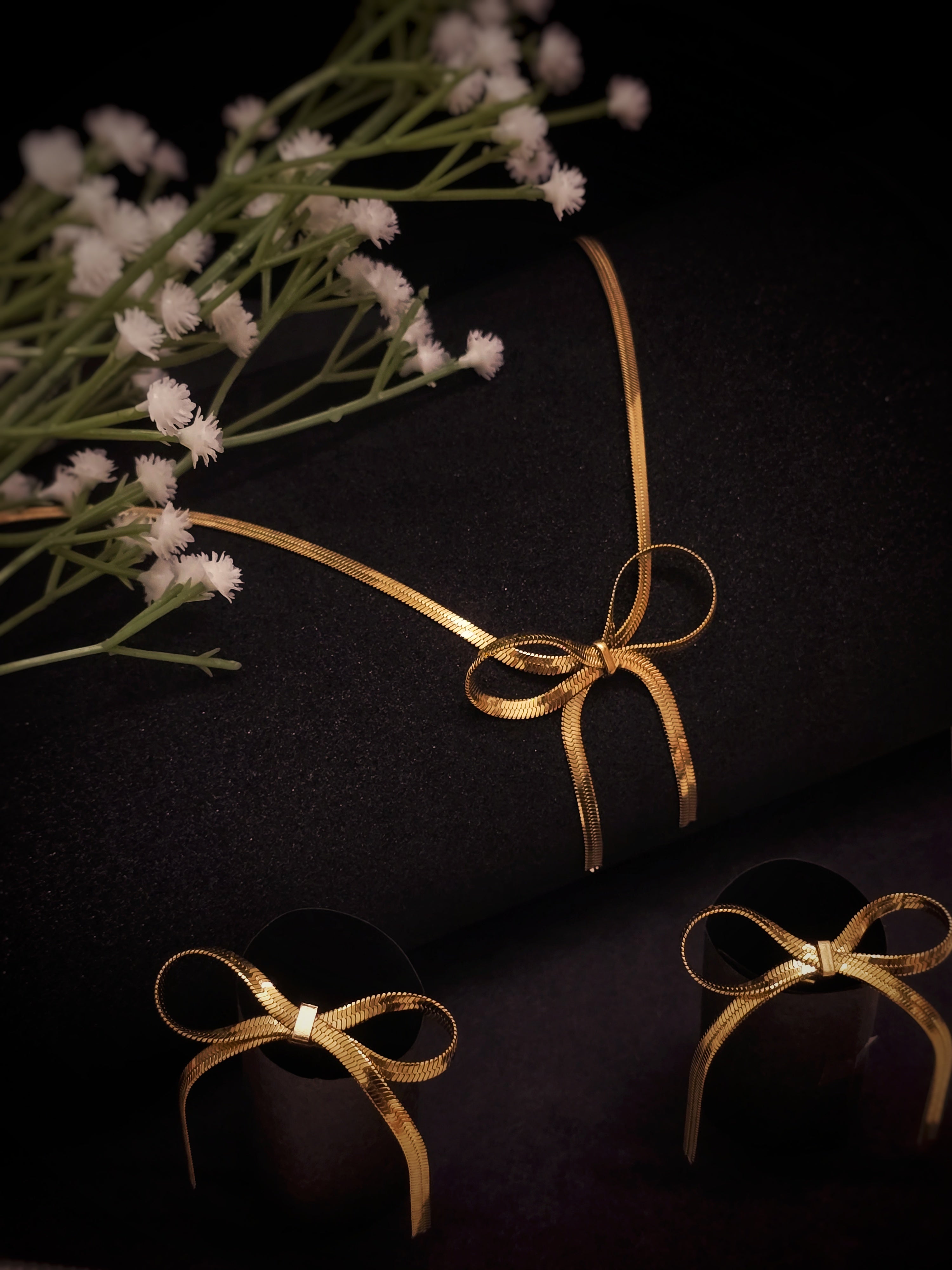 Pair this bow set with an off-shoulder dress, silk blouse, or evening gown for a polished and romantic look. It also works beautifully as a statement accessory with a minimalist outfit for a touch of luxury.