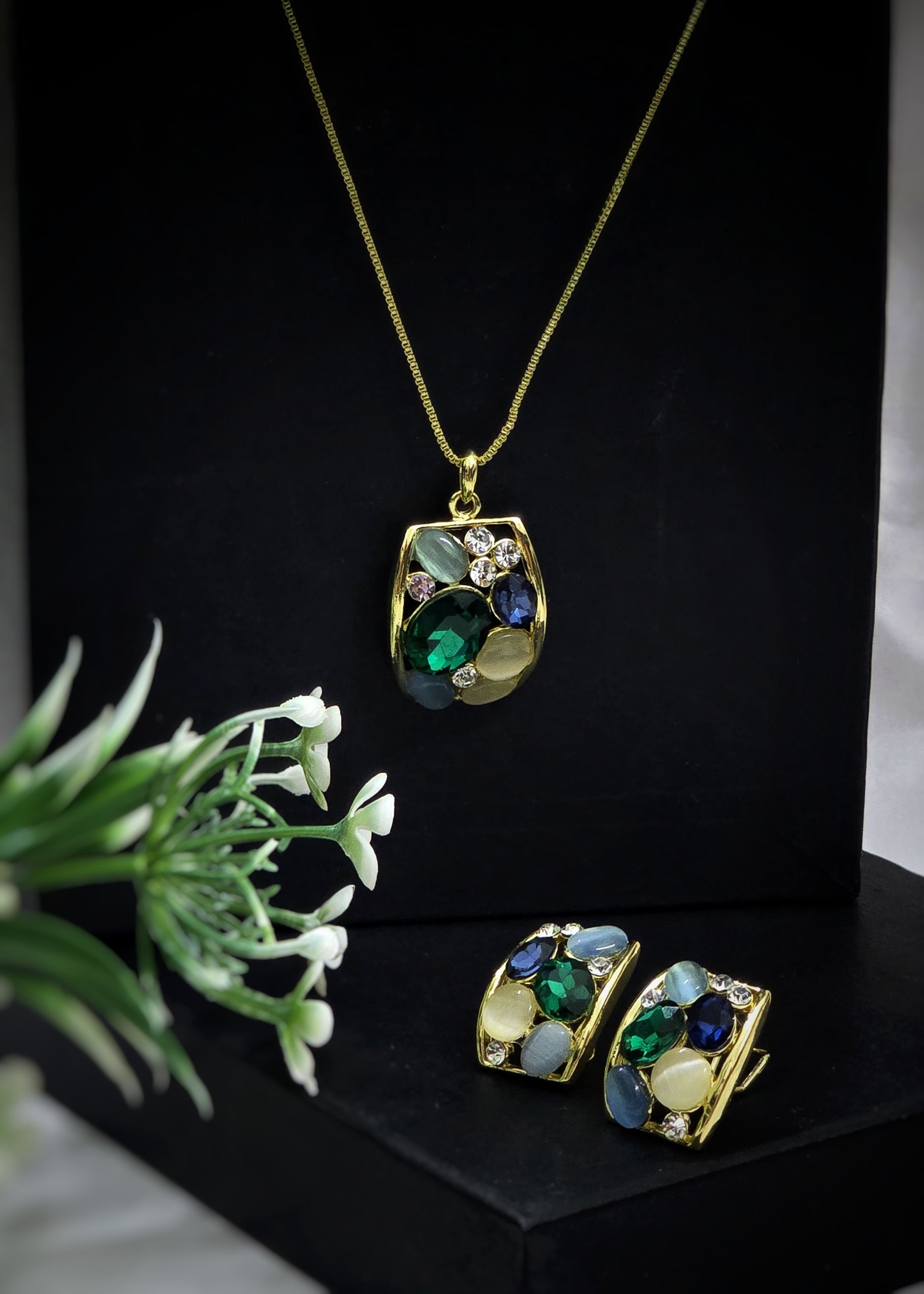 Pair this set with a deep-colored outfit like emerald green, royal blue, or black to let the multi-colored stones shine. Add minimal rings or bangles to keep the focus on this statement jewelry.