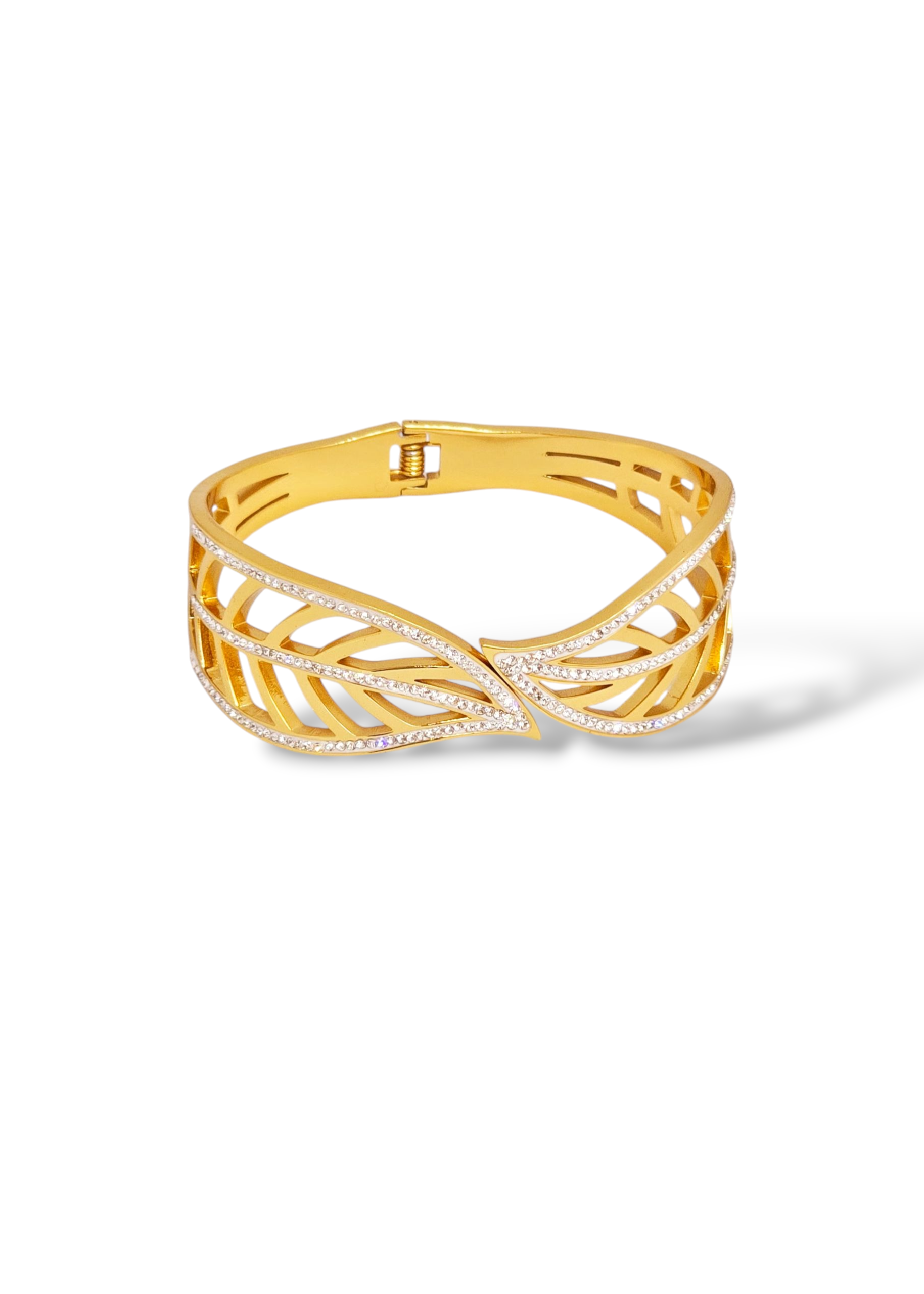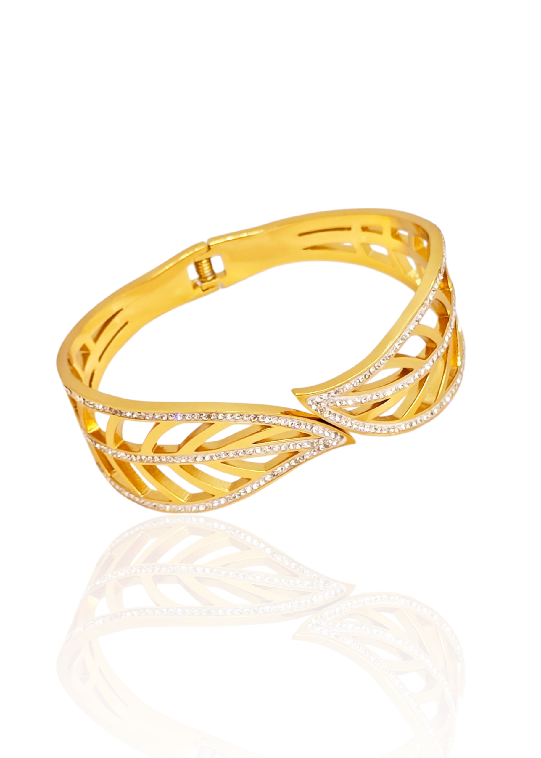 Bold and luxurious, the Regalia Cutwork Statement Bracelet is a true showstopper. Featuring an intricate leaf-inspired cutwork design adorned with fine crystal accents, this gold-toned hinged bangle is crafted to elevate your most special occasions with grace and grandeur. A blend of traditional motif and modern glamour, it's a must-have for your festive and formal collection.