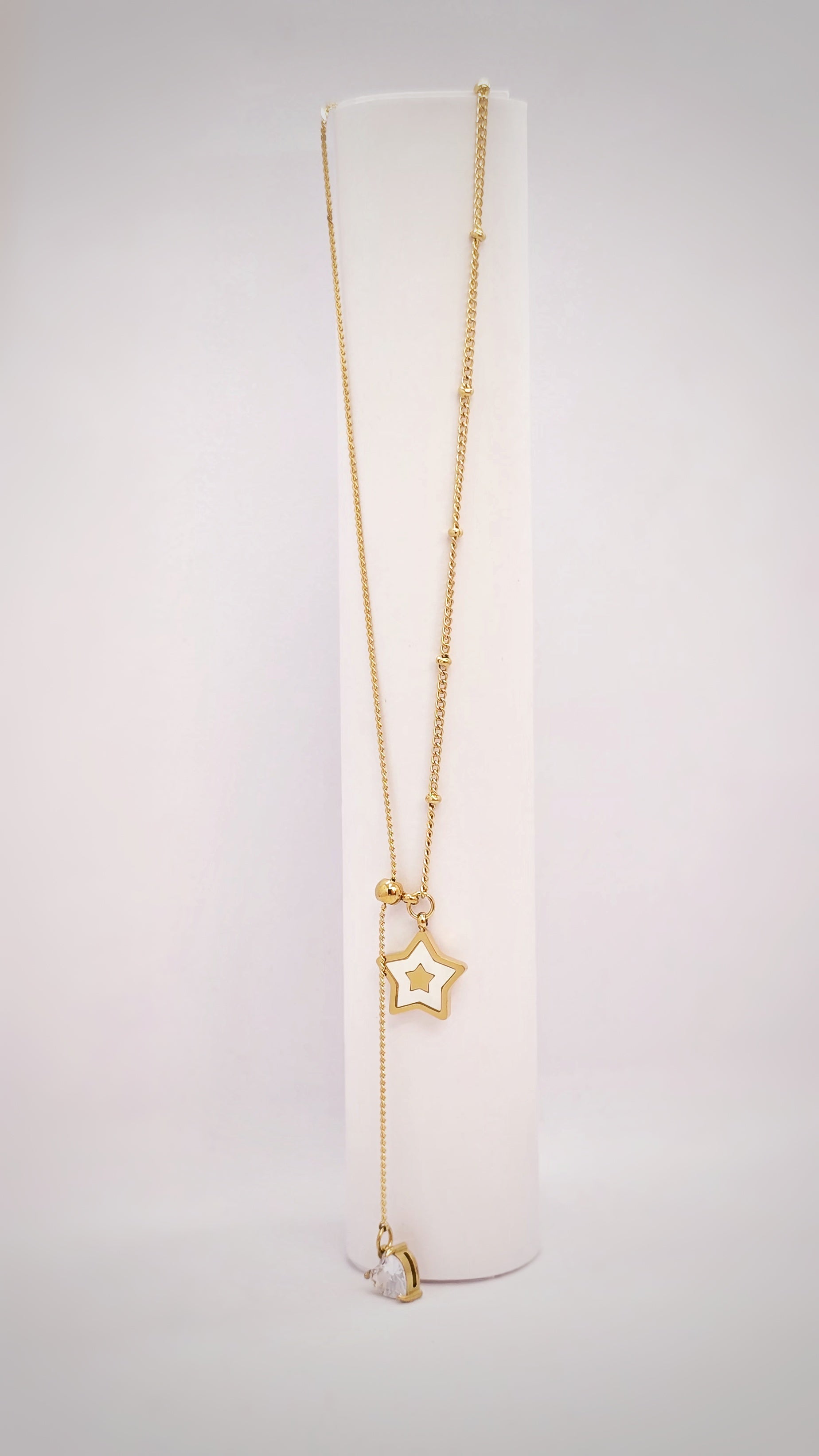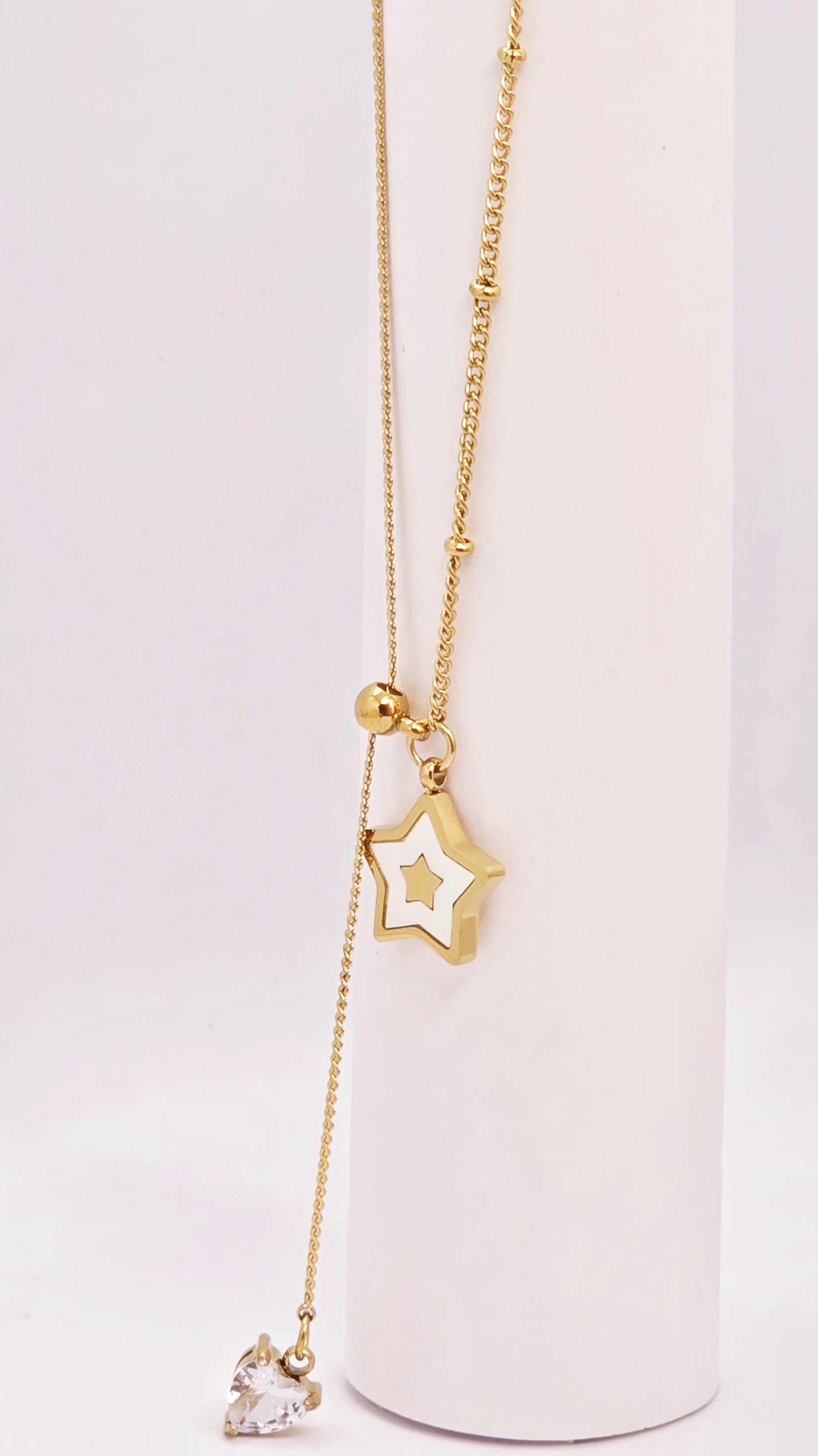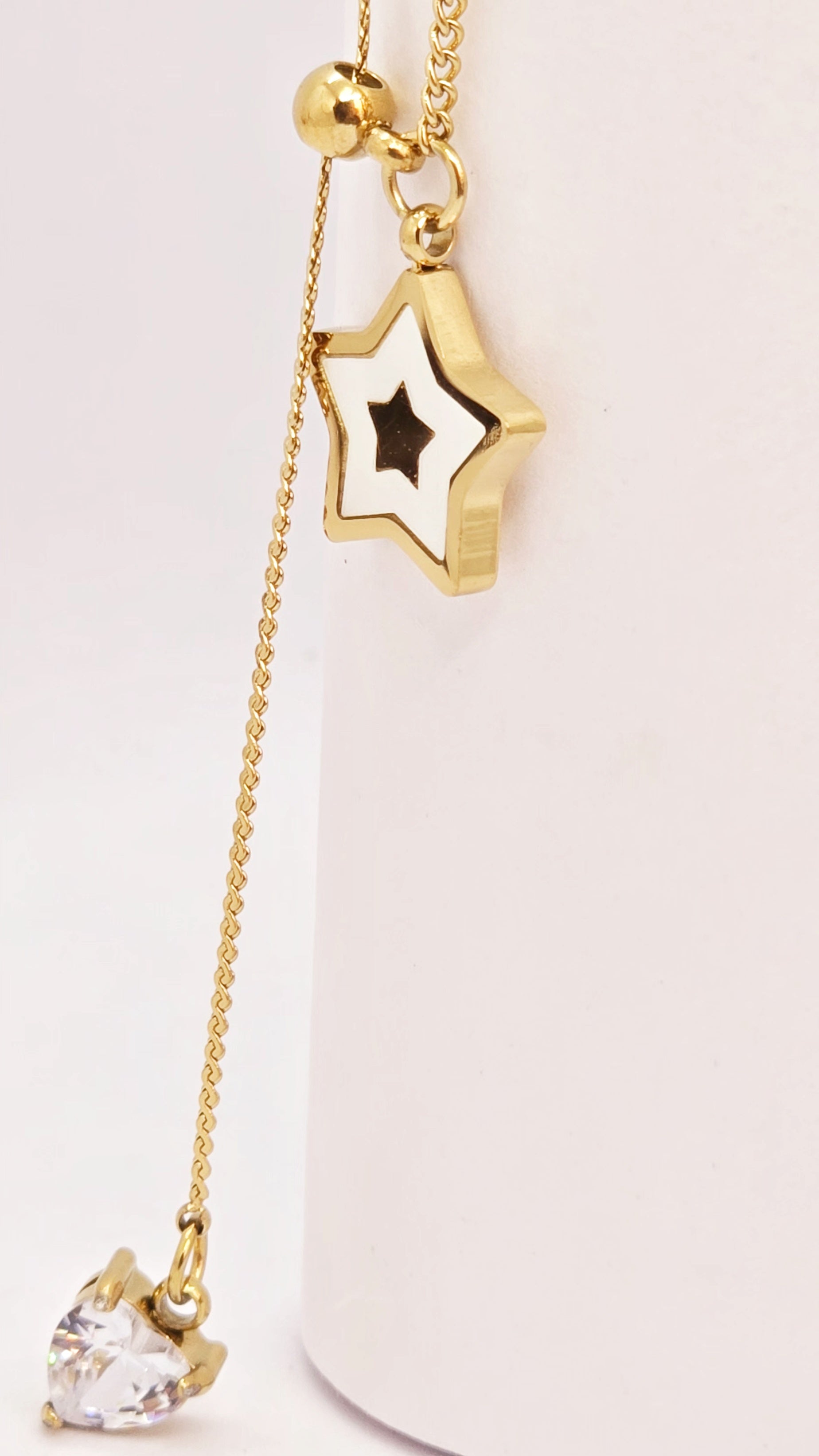 Add a touch of whimsical elegance with the Adorniv Starlight Drop Pendant Necklace. This gold-tone necklace features a unique double charm design — a hollow star with a white enamel inlay and a sparkling heart-shaped crystal drop. Its fine chain with subtle bead accents and a sliding bead adjuster gives it a versatile, graceful fall.